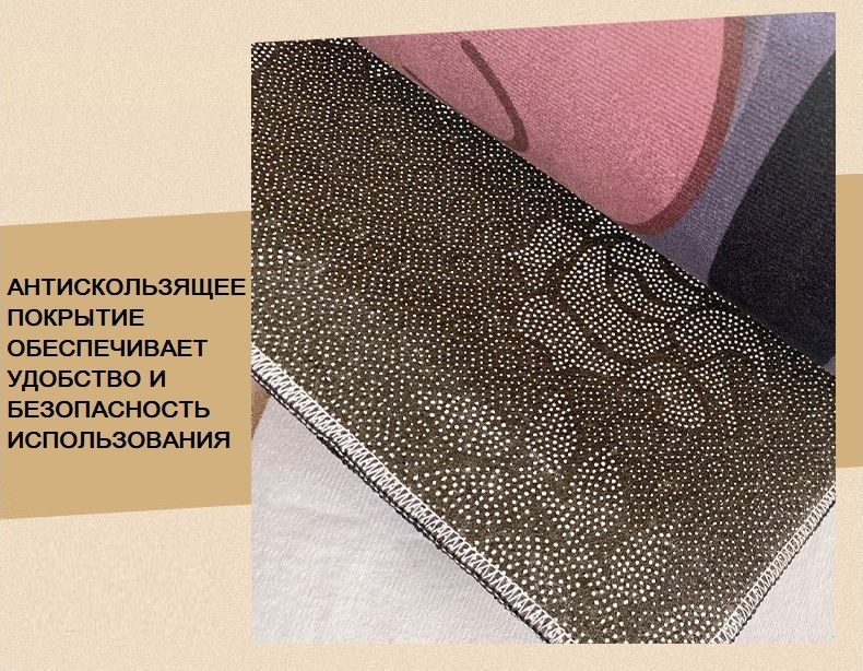 Ковер выполнен из мягкой и нежной микрофибры, очень приятной на ощупь. Данный материал не вызывает аллергии, так как не скапливает в себе пыль и сор из-за отсутствия ворса. Коврики абсолютно не скользят и не загибаются, с обратной стороны у них антискользящее покрытие. Не линяют при стирке, сохраняя свежий и яркий внешний вид.
