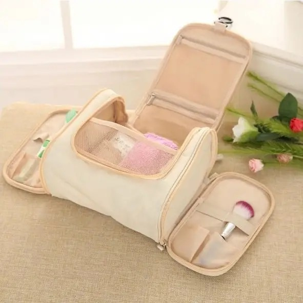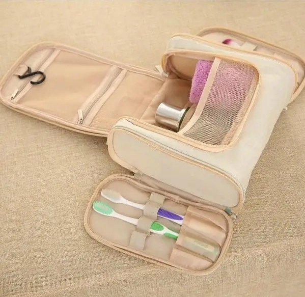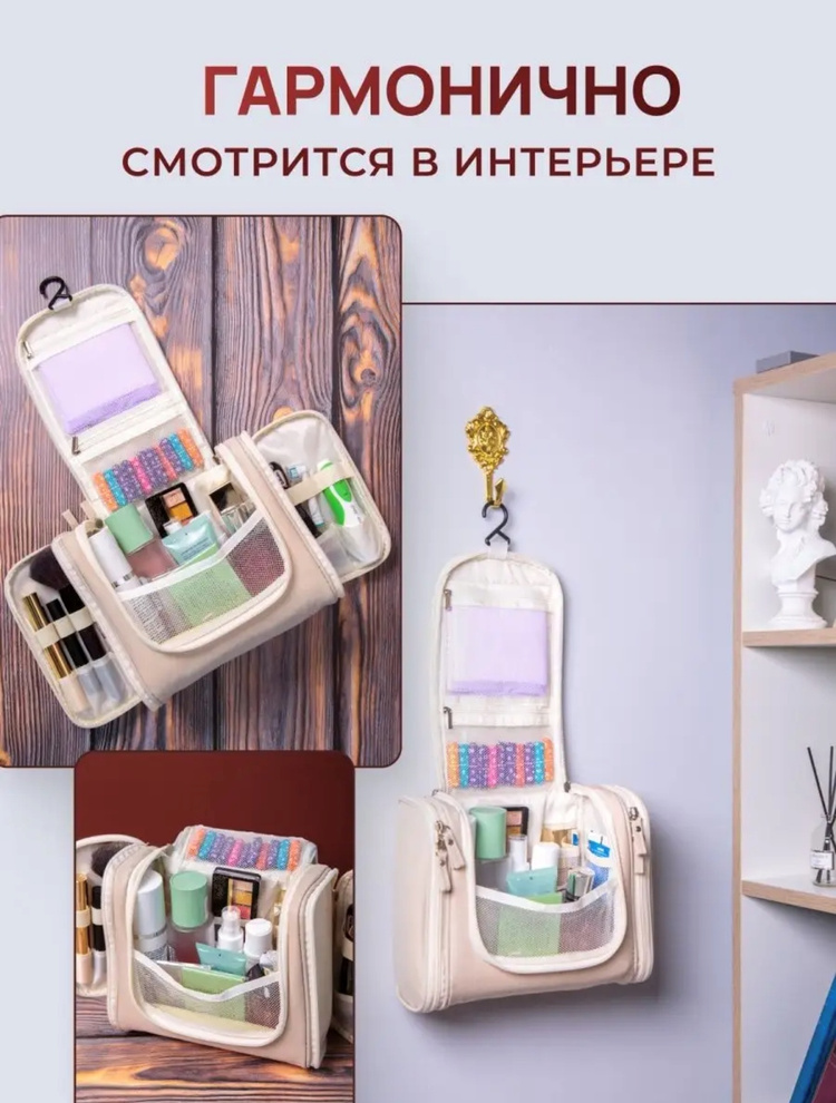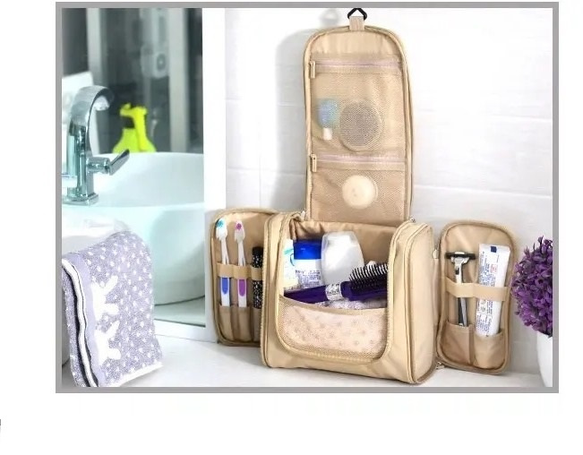 Несессер снабжен ручкой для удобства переноски и крючком, позволяющим подвесить несессер в ванной комнате гостиничного номера или любом другом месте