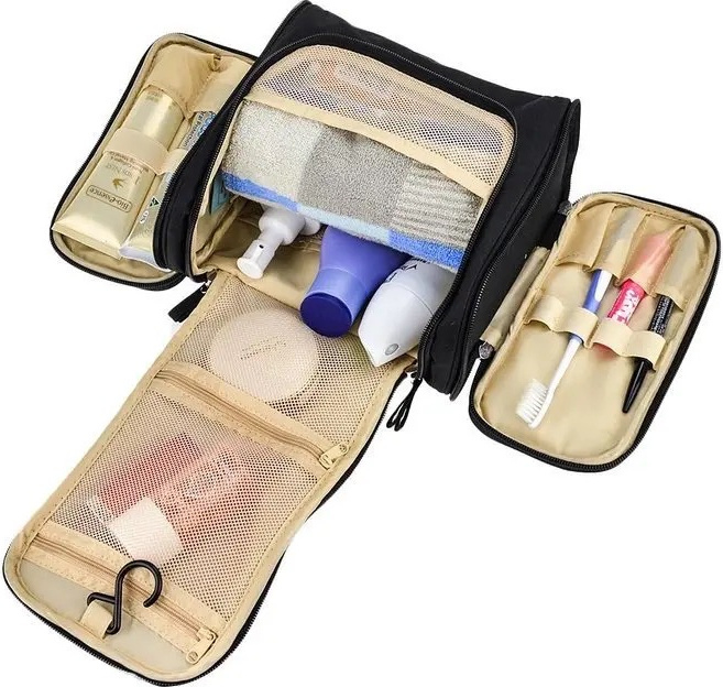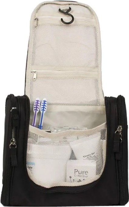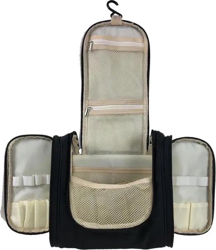 Несессер снабжен ручкой для удобства переноски и крючком, позволяющим подвесить несессер в ванной комнате гостиничного номера или любом другом месте