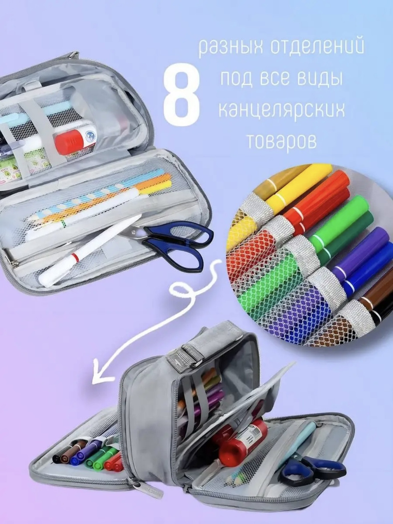 Пенал школьный для подростков состоит из одного большого отделения, где можно разместить линейки, фломастеры и другие товары для школы. В кармане из сетки на молнии можно хранить мелкие предметы: ластик, стикеры, наушники, USB-кабель, карты и прочее. Также есть вкладыш для удобной организации карандашей и ручек. Художники могут использовать пенал для карандашей, акварели и кистей.