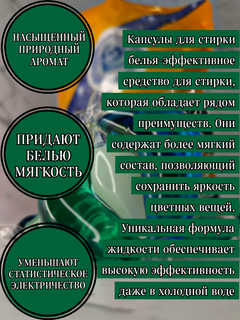 Свежее, мягкое белье после каждой стирки. Капсулы предотвращают деформацию и износ белья во время стирки. Благодаря инновационной формуле, капсула обволакивает волокна одежды и сохраняет их во время стирки. Капсулы безопасны для окружающие среды, безопасны для стирки детских вещей. Гипоаллергенный состав не вызывает побочных эффектов на коже. Хранить в недоступном для детей месте.