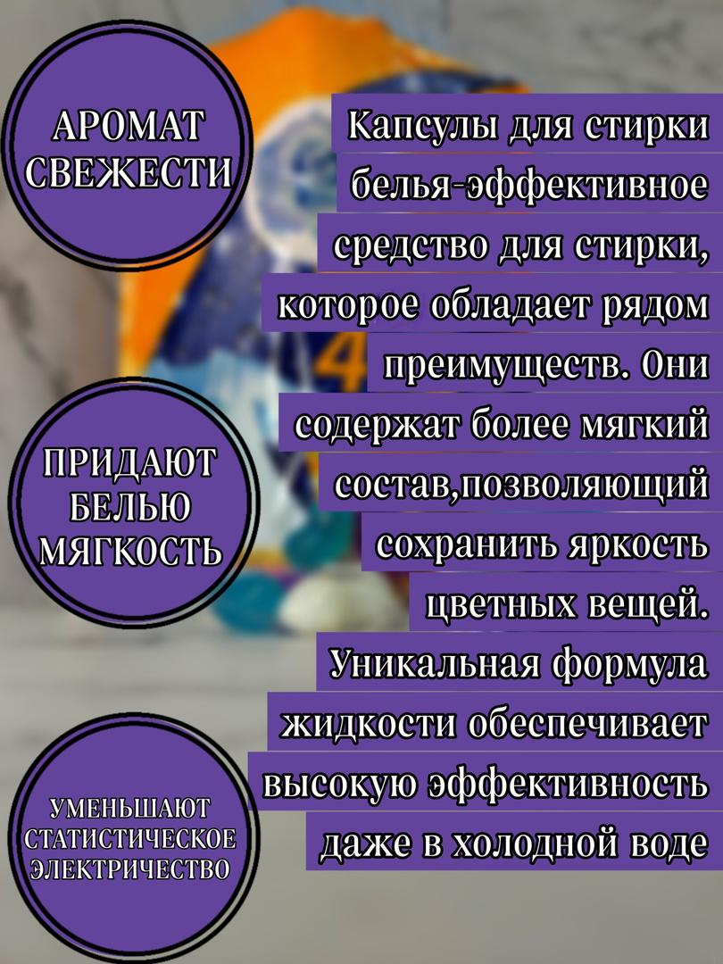Наши капсулы  подходят для стирки любой одежды, постельного белья, нижнего белья, для таких тканей как шёлк, хлопок, синтетика, полиэстер, шерсть, лён, вискоза, акрил, атлас .Состав капсул глубоко проникает в загрязненные участки одежды и вымывает даже самые стойкие загрязнения а также жирные пятна .Стирка Ваших вещей не будет приносить проблем с нашими капсулами для стирки. Также данные капсулы помогут  восстановить цвет старых вещей. Капсулы для стирки сочетают в себе свойства стирального порошка ,отбеливатель, восстановитель цвета. Стирка с использованием капсул - деликатная стирка, нежная, бережная, можно стирать детские вещи. Самые мягкие ткани останутся в целости и сохранности.